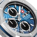 Die SMWGL0007001 Damask Legend – Windstorm ist eine limitierte und auf nur 100 Exemplare nummerierte Uhr. Sie verfügt über ein tiefblaues, mit Damaszener-Verfahren behandeltes Zifferblatt, kombiniert mit schwarzen Hilfszifferblättern. Bei der Damaszener-Behandlung wird Stahl geschmiedet, geschweißt und geschichtet, um ein einzigartiges Muster zu erzeugen. Das in der Schweiz gefertigte Automatik-Chronographenwerk ETA 7750 verfügt über eine Gangreserve von 42 Stunden, und die verschraubte Krone und Drücker, das Saphirglas sowie eine Wasserdichtigkeit von 10 ATM gewährleisten Langlebigkeit.