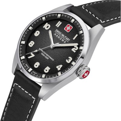 Diese Swiss Military Hanowa Uhr hat ein Edelstahl Gehäuse mit einem Durchmesser von 42 mm und ist mit einem Armband aus Leder versehen. In der Uhr arbeitet ein Ronda Uhrwerk. Das Glas der Uhr besteht aus Sapphir - Glas.