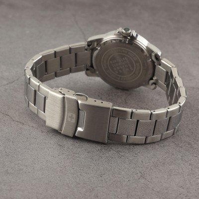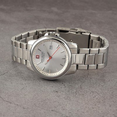 Diese Swiss Military Hanowa Uhr hat ein Edelstahl Gehäuse mit einem Durchmesser von 32 mm und ist mit einem Armband aus Edelstahl versehen. In der Uhr arbeitet ein Ronda Uhrwerk. Das Glas der Uhr besteht aus Sapphir - Glas.