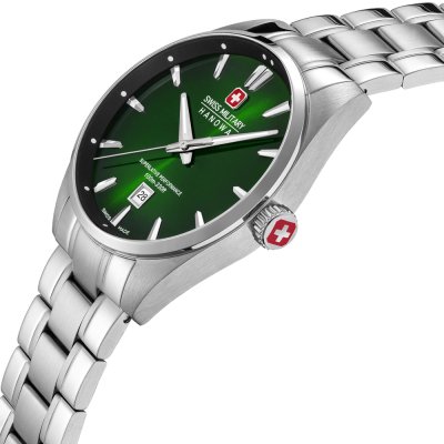 Diese Swiss Military Hanowa Uhr hat ein Edelstahl Gehäuse mit einem Durchmesser von 42 mm und ist mit einem Armband aus Edelstahl versehen. In der Uhr arbeitet ein Ronda Uhrwerk. Das Glas der Uhr besteht aus Sapphir - Glas.