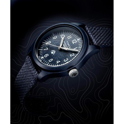 Die Expedition Traprock Uhr wurde für alle entwickelt, die die Natur lieben und ihren ökologischen Fußabdruck minimieren wollen. Die Uhr besteht aus langlebigen und umweltfreundlichen Materialien wie einem robusten Gehäuse aus Öko-Keramik, das aus Rizinusöl hergestellt wird, und einem konisch zulaufenden Stoffarmband aus 100 % recyceltem Kunststoff, das mit veganem Apfelleder gefüttert ist. Das japanische Solaruhrwerk mit einer Gangreserve von 4 Monaten macht einen Batteriewechsel überflüssig. Die Expedition Traprock verbindet außerdem Funktionalität mit Stil: Auf dem strukturierten Zifferblatt ist ein detailliertes topografisches Muster eingraviert, und die erdigen Farben passen zu jeder Outdoor-Ausrüstung.