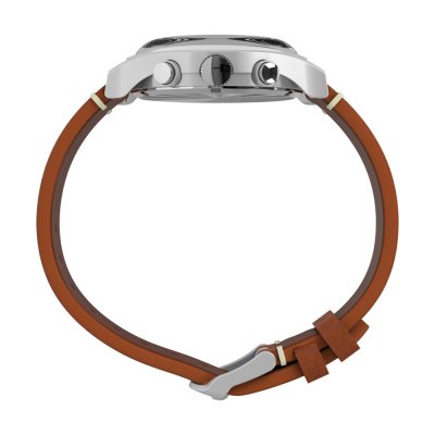 Diese Timex Uhr hat ein Edelstahl Gehäuse mit einem Durchmesser von 40 mm und ist mit einem Armband aus Leder versehen. In der Uhr arbeitet ein Timex Uhrwerk. Das Glas der Uhr besteht aus Acryl - Glas.