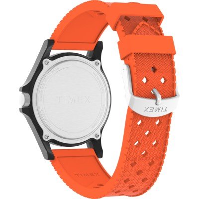 Diese Timex Uhr hat ein Kunstharz Gehäuse mit einem Durchmesser von 40 mm und ist mit einem Armband aus Kautschuk versehen. In der Uhr arbeitet ein Timex Uhrwerk. Das Glas der Uhr besteht aus Acryl - Glas.