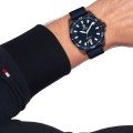 Diese Tommy Hilfiger Uhr hat ein Karbonverstärktes Kunstharz Gehäuse mit einem Durchmesser von 42 mm und ist mit einem Armband aus Kautschuk versehen. In der Uhr arbeitet ein Miyota Uhrwerk. Das Glas der Uhr besteht aus Mineral - Glas.