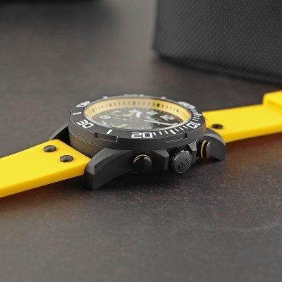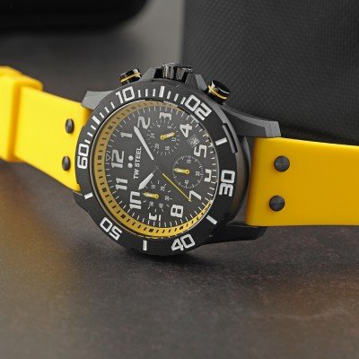 Diese TW Steel Uhr hat ein Carbon Gehäuse mit einem Durchmesser von 44 mm und ist mit einem Armband aus Kautschuk versehen. In der Uhr arbeitet ein Seiko Instruments Inc. Uhrwerk. Das Glas der Uhr besteht aus Gehärtetem Mineral - Glas.