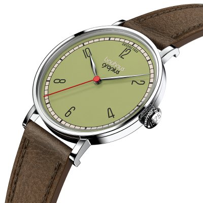 Diese Walter Gropius Uhr hat ein Edelstahl Gehäuse mit einem Durchmesser von 38 mm und ist mit einem Armband aus Leder versehen. In der Uhr arbeitet ein Miyota Uhrwerk. Das Glas der Uhr besteht aus Doppel antireflex Saphirglas - Glas.