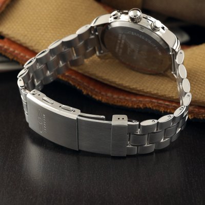 Diese Zeppelin Uhr hat ein Edelstahl Gehäuse mit einem Durchmesser von 42 mm und ist mit einem Armband aus Edelstahl versehen. In der Uhr arbeitet ein Ronda Uhrwerk. Das Glas der Uhr besteht aus K1 Mineral - Glas.