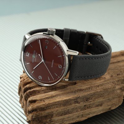 Diese Zeppelin Uhr hat ein Edelstahl Gehäuse mit einem Durchmesser von 40 mm und ist mit einem Armband aus Textil versehen. In der Uhr arbeitet ein Miyota Uhrwerk. Das Glas der Uhr besteht aus K1 Mineral - Glas.