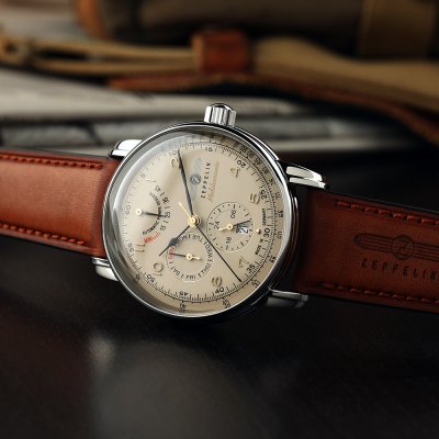 Diese Zeppelin Uhr hat ein Edelstahl Gehäuse mit einem Durchmesser von 42 mm und ist mit einem Armband aus Leder versehen. In der Uhr arbeitet ein Miyota Uhrwerk. Das Glas der Uhr besteht aus K1 Mineral - Glas.