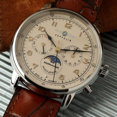 Diese Zeppelin Uhr hat ein Edelstahl Gehäuse mit einem Durchmesser von 42 mm und ist mit einem Armband aus Leder versehen. In der Uhr arbeitet ein Ronda Uhrwerk. Das Glas der Uhr besteht aus K1 Mineral - Glas.