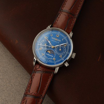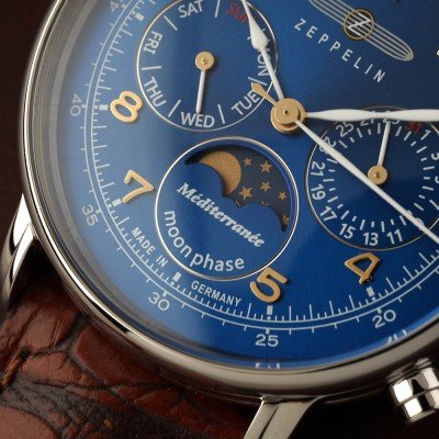 Diese Zeppelin Uhr hat ein Edelstahl Gehäuse mit einem Durchmesser von 36 mm und ist mit einem Armband aus Leder versehen. In der Uhr arbeitet ein Ronda Uhrwerk. Das Glas der Uhr besteht aus K1 Mineral - Glas.
